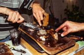 Domowej roboty grillowane dorado ryby z warzywami zawinięte w folię aluminiową na rustykalnym stole. Widok z góry.