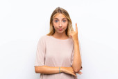 Młoda blondynka nad odizolowanym niebieskim tle wskazując