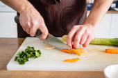 Zdjęcie "Kucharka kroi marchewkę na drewnianej desce" może być wykorzystywane do celów osobistych i komercyjnych zgodnie z warunkami zakupionej licencji Royalty-free. Obraz jest dostępny do pobrania w jakości wysokiej rozdzielczości do 5760x3840.