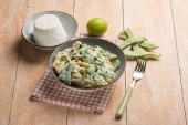 Zdrowa sałatka z kiszonej kapusty, groszek w puszce i jabłko w misce na jasnoniebieskim tle, Widok z góry