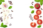 Cały i krojony pomidor z liśćmi bazylii i czosnkiem, przyprawa, położony wokół krawędzi do projektowania izolowane na białym tle