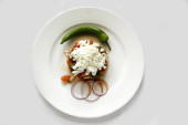 Tradycyjne rumuńskie domowe danie z galaretką wieprzową o nazwie Piftie. Jellied pork aspic z mięsa wieprzowego serwowane z papryki i pietruszki świeżej.