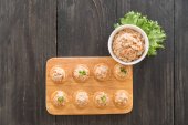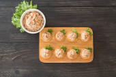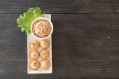 widok z góry pyszne Khinkali z kolendry na talerzu na brązowym drewnianym stole