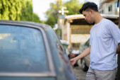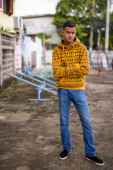 Młody afrykański turysta stojący i myślący na kładce metra