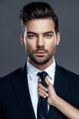 mięśnie silny piękny mężczyzna model w formalny niebieski garnitur z emocjami na szary izolowane czcionki tło z cienie