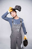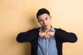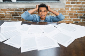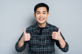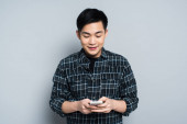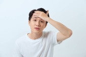 wstrząśnięty Azjata dotykający czoła i patrzący w kamerę trzymając termometr na szarym tle