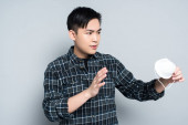 Zdjęcie "wstrząśnięty Azjata dotykający czoła i patrzący w kamerę trzymając termometr na szarym tle" może być wykorzystywane do celów osobistych i komercyjnych zgodnie z warunkami zakupionej licencji Royalty-free. Obraz jest dostępny do pobrania w jakości wysokiej rozdzielczości do 5760x3840.