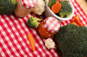 Żywienie niemowląt w słoikach z marchewką, brokułami i kalafiorem na desce do krojenia na obrusach w kratkę