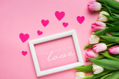 Top widok tulipany z szczęśliwy dzień kobiet napisy na papierze etykieta pobliżu prezent na różowym tle