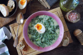 Polska zupa Zurek. Kwaśna zupa z kiełbasą, ziemniakami i jajkami
