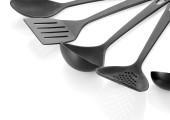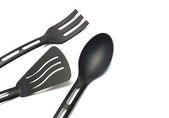 Przybory do gotowania, łopatka, łyżka, pęseta do gotowania, białe tło, zbliżenie, izolat.
