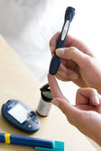 Cukrzyca, robi pomiaru glukozy we krwi. Kobieta za pomocą lancet i Glukometr.