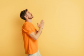 szczęśliwy człowiek macha ręką przed kamerą trzymając laptopa na żółtym tle