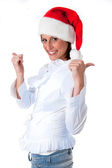 Pełna długość ładna kobieta trzyma kolory torby na zakupy i noszenie santa