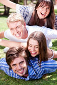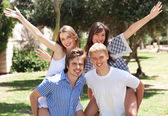 dwóch młodych mężczyzn, dając jej kochanka świnka z powrotem w parku