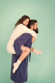Zdjęcie "Cieszymy się razem spędzonym czasem. Rutyna małżeńska. para zakochana ciężko się obudzić. - Dzień dobry. leniwy początek dnia. Brodaty mężczyzna i kobieta noszą szlafrok. Cieszący się czasem w domu" może być wykorzystywane do celów osobistych i komercyjnych zgodnie z warunkami zakupionej licencji Royalty-free. Obraz jest dostępny do pobrania w jakości wysokiej rozdzielczości do 5760x3840.