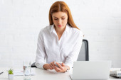 Atrakcyjna bizneswoman z klockami i gadżetami na stole w biurze
