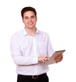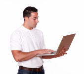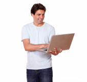 atrakcyjny rudowłosy mężczyzna pracujący na swoim laptopie