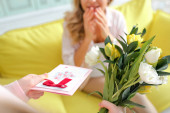 panoramiczne ujęcie dziecka trzymającego tulipany i kartkę z życzeniami szczęśliwej matki