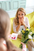 selektywne skupienie zaskoczonego dziecka patrząc na kwiaty w ręce matki