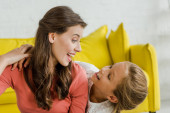 szczęśliwy matka patrząc na córkę z tulipany na niebieski