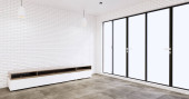 Nowoczesny dom z drewnianą podłogą i dekoracyjną drewnianą częścią ściany