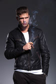 Zdjęcie "młody człowiek palenia w skórzaną kurtkę" może być wykorzystywane do celów osobistych i komercyjnych zgodnie z warunkami zakupionej licencji Royalty-free. Obraz jest dostępny do pobrania w jakości wysokiej rozdzielczości do 5760x3840.