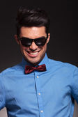 przypadkowy mężczyzna ściąga okulary i otwiera koszula