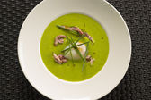 Zupa warzywna z zielonego groszku w białym talerzu. Zupa z puree z krakersami i wędzonym bekonem.