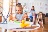 Zdjęcie "Piękny nauczyciel i maluch noszący diadem jednorożca rysunek przy użyciu papieru i ołówków wokół wielu zabawek w przedszkolu" może być wykorzystywane do celów osobistych i komercyjnych zgodnie z warunkami zakupionej licencji Royalty-free. Obraz jest dostępny do pobrania w jakości wysokiej rozdzielczości do 5760x3840.