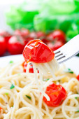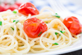 pyszne spaghetti z pomidorami i jajko w koszulce