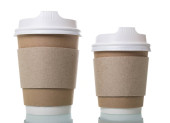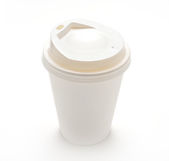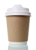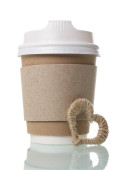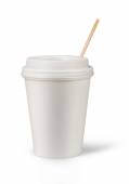 Jednorazowy kubek z wieczkiem i drewnianą łyżką do kawy, izolowany na biało