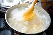 Ciasto wylewające się z metalowego wiadra na smażoną patelnię. Proces pieczenia naleśników.