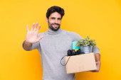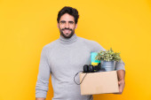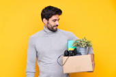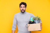 Młody przystojny mężczyzna z brodą wykonujący ruch podnosząc pudełko pełne rzeczy na odosobnionym tle ze smutnym wyrazem twarzy