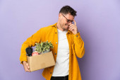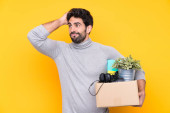 Zdjęcie "Młody przystojny mężczyzna z brodą wykonujący ruch podnosząc pudełko pełne rzeczy na odosobnionym tle ze smutnym wyrazem twarzy" może być wykorzystywane do celów osobistych i komercyjnych zgodnie z warunkami zakupionej licencji Royalty-free. Obraz jest dostępny do pobrania w jakości wysokiej rozdzielczości do 5760x3840.