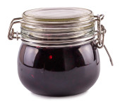Sos żurawinowy w otwartym szklanym słoiku stożkowym z łyżeczką leżącą na szyi odizolowaną na białym tle