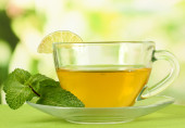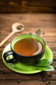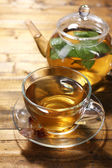 Puchar i czajnik ziołowe herbaty z mięty kwiaty na drewnianym stole