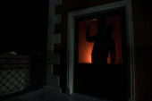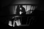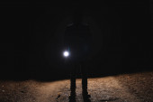 mężczyzna ochrona z latarka idzie w górę schody w ciemności