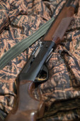 widok z bliska z czarnej strzelby myśliwskiej i noża karambit na tle kamuflażu
