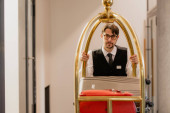 Współczesny biznes ludzie komunikują się podczas Portier porusza się wśród nich i pchania wózka z bagażem wewnątrz hotelu