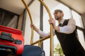 Zdjęcie "Współczesny biznes ludzie komunikują się podczas Portier porusza się wśród nich i pchania wózka z bagażem wewnątrz hotelu" może być wykorzystywane do celów osobistych i komercyjnych zgodnie z warunkami zakupionej licencji Royalty-free. Obraz jest dostępny do pobrania w jakości wysokiej rozdzielczości do 5760x3840.