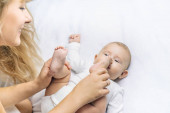 Zabawne małe dziecko bawiące się z mamą na dzianinie