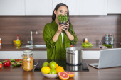 Zdjęcie "Pozytywne zachwycony kobieta strzelanie jej gotowanie vlog" może być wykorzystywane do celów osobistych i komercyjnych zgodnie z warunkami zakupionej licencji Royalty-free. Obraz jest dostępny do pobrania w jakości wysokiej rozdzielczości do 5760x3840.