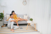 Młoda azjatycka para siedzi na kanapie w domu, używając tabletu Pc do Internetu i mediów społecznościowych.
