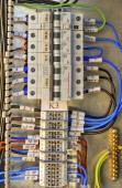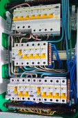 Automatyczne przełączniki z przewodami w osłonie elektrycznej zamknąć. Osłona elektryczna z automatycznymi wyłącznikami elektrycznymi w domu - panel sterowania elektrycznością z obwodem