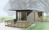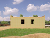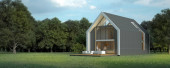 Komercyjny budynek publiczny lub pawilon z dachem dwuspadowym. Nowoczesna, kreatywna fasada ze szklaną grupą wejściową i drewnianymi ścianami listew. Odbiór. 3d renderowanie