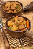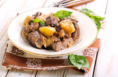 smażyć domowe wołowiny z warzywami w misce kolor, na tle drewniane