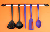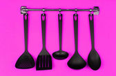 Plastikowe naczynia na srebrne haczyki na tle liliowy