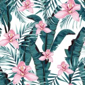 Różowe flamingi i egzotyczne liście palmowe, różowe tło. Kwiatowy bezszwowy wzór. Tropikalna ilustracja. Egzotyczne rośliny, ptaki. Letni projekt plaży. Rajska natura.