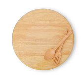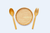 Pusty drewniany talerz z łyżką i widelcem izolowane na białym tle